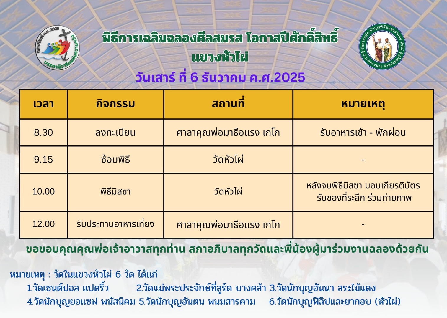 แขวงหัวไผ่ สังฆมณฑลราชบุรี ขอเชิญพี่น้องสัตบุรุษทุกท่านร่วมเป็นหนึ่งเดียวกันในพิธีเฉลิมฉลองศีลสมรส เนื่องในโอกาส ปีศักดิ์สิทธิ์ ค.ศ. 2025 ซึ่งพระศาสนจักรสากลกำหนดให้เป็นปีแห่งความหวัง ภายใต้หัวข้อ “บรรดาผู้จาริกแห่งความหวัง” เพื่อฟื้นฟูชีวิตฝ่ายจิตและเสริมสร้างความมั่นคงในความเชื่อ พิธีจะจัดขึ้นในวันเสาร์ที่ 6 ธันวาคม ค.ศ. 2025 โดยมีวัตถุประสงค์เพื่อร่วมภาวนาและเฉลิมฉลองศีลศักดิ์สิทธิ์แห่งความรักและความเป็นหนึ่งเดียวของคู่สมรสในพระคริสตเจ้า พร้อมทั้งแบ่งปันความยินดีในชุมชนแห่งความเชื่อ การเฉลิมฉลองครั้งนี้เป็นโอกาสสำคัญที่สัตบุรุษจะได้ร่วมกันภาวนาเพื่อครอบครัวคริสตชน ให้ดำเนินชีวิตด้วยความรัก ความเชื่อ และความหวังในพระเจ้า และเป็นพยานแห่งความเชื่อในสังคมปัจจุบัน แขวงหัวไผ่ขอเชิญชวนพี่น้องทุกท่านมาร่วมพิธีกรรมอันศักดิ์สิทธิ์นี้ เพื่อร่วมกันเป็นหนึ่งเดียวในพระคริสตเจ้า และร่วมเฉลิมฉลองปีศักดิ์สิทธิ์แห่งความหวังด้วยความศรัทธาและความยินดี แหล่งที่มา : https://www.facebook.com/share/p/1AGMyR4c7L/