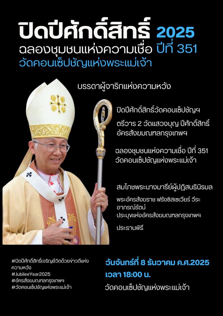 อัครสังฆมณฑลกรุงเทพฯ ขอเชิญพี่น้องสัตบุรุษร่วมพิธีบูชาขอบพระคุณ เนื่องในโอกาส ปิดปีศักดิ์สิทธิ์ ค.ศ. 2025 “บรรดาผู้จาริกแห่งความหวัง” และการเฉลิมฉลอง สมโภชพระนางมารีย์ผู้ปฏิสนธินิรมล พร้อมทั้งการฉลองชุมชนแห่งความเชื่อครบ 351 ปี วัดคอนเซ็ปชัญ กรุงเทพฯ พิธีจะจัดขึ้นในวัน จันทร์ที่ 8 ธันวาคม ค.ศ. 2025 เวลา 18.00 น. ณ วัดคอนเซ็ปชัญ กรุงเทพฯ โดยมี พระอัครสังฆราช ฟรังซิสเซเวียร์ วีระ อาภรณ์รัตน์ ประมุขแห่งอัครสังฆมณฑลกรุงเทพฯ เป็นประธานในพิธีบูชาขอบพระคุณ นอกจากนี้ อัครสังฆมณฑลกรุงเทพฯ ยังได้กำหนดพิธีบูชาขอบพระคุณปิดปีศักดิ์สิทธิ์อย่างเป็นทางการ ในวัน อาทิตย์ที่ 28 ธันวาคม ค.ศ. 2025 เวลา 17.00 น. ณ อาสนวิหารอัสสัมชัญ กรุงเทพฯ โดยมีพระอัครสังฆราช ฟรังซิสเซเวียร์ วีระ อาภรณ์รัตน์ เป็นประธาน ทั้งนี้ เพื่อให้สัตบุรุษได้ร่วมเป็นหนึ่งเดียวกันในจิตตารมณ์ของปีศักดิ์สิทธิ์ […]