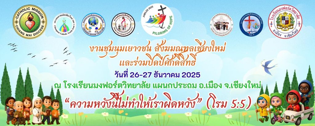 สังฆมณฑลเชียงใหม่ขอเชิญน้อง ๆ เยาวชนทุกคนเข้าร่วม งานชุมนุมเยาวชนสังฆมณฑลเชียงใหม่ พร้อมกิจกรรมพิเศษเนื่องในโอกาส ปิดปีศักดิ์สิทธิ์ ค.ศ. 2025 ภายใต้หัวข้อ “บรรดาผู้จาริกแห่งความหวัง” ซึ่งพระศาสนจักรสากลประกาศให้เป็นปีแห่งความหวัง เพื่อฟื้นฟูชีวิตฝ่ายจิตและเสริมสร้างความมั่นคงในความเชื่อของเยาวชนคริสตชน งานชุมนุมครั้งนี้จะจัดขึ้นในวันที่ 26–27 ธันวาคม ค.ศ. 2025 ณ โรงเรียนมงฟอร์ตวิทยาลัย แผนกประถม จังหวัดเชียงใหม่ โดยมุ่งเน้นให้เยาวชนได้มีโอกาสพบปะ แลกเปลี่ยนประสบการณ์ และร่วมกิจกรรมฝ่ายจิตที่หลากหลาย อาทิ การภาวนา การแบ่งปันพระวาจา และกิจกรรมสร้างสรรค์ที่ช่วยเสริมสร้างความหวังและความรักในพระคริสตเจ้า กิจกรรมทั้งหมดจัดขึ้นภายใต้พระวาจา “ความหวังนี้ไม่ทำให้เราผิดหวัง” (โรม 5:5) เพื่อย้ำเตือนเยาวชนว่าความหวังในพระเจ้าจะเป็นพลังนำทางชีวิต และเป็นแรงบันดาลใจให้ดำเนินชีวิตคริสตชนอย่างมั่นคงในโลกยุคปัจจุบัน พี่น้องเยาวชนที่สนใจสามารถติดต่อสอบถามรายละเอียดเพิ่มเติมได้ที่ คุณพ่อเจ้าวัด หรือ คุณพ่อจิตตาภิบาลแต่ละเขต เพื่อร่วมเป็นส่วนหนึ่งของการเฉลิมฉลองปีศักดิ์สิทธิ์ และสร้างความทรงจำแห่งความเชื่อ ความรัก และความหวังร่วมกันในชุมชนคริสตชนของสังฆมณฑลเชียงใหม่ แแหล่งที่มา : https://www.facebook.com/share/p/1HEqZTG1Ar/