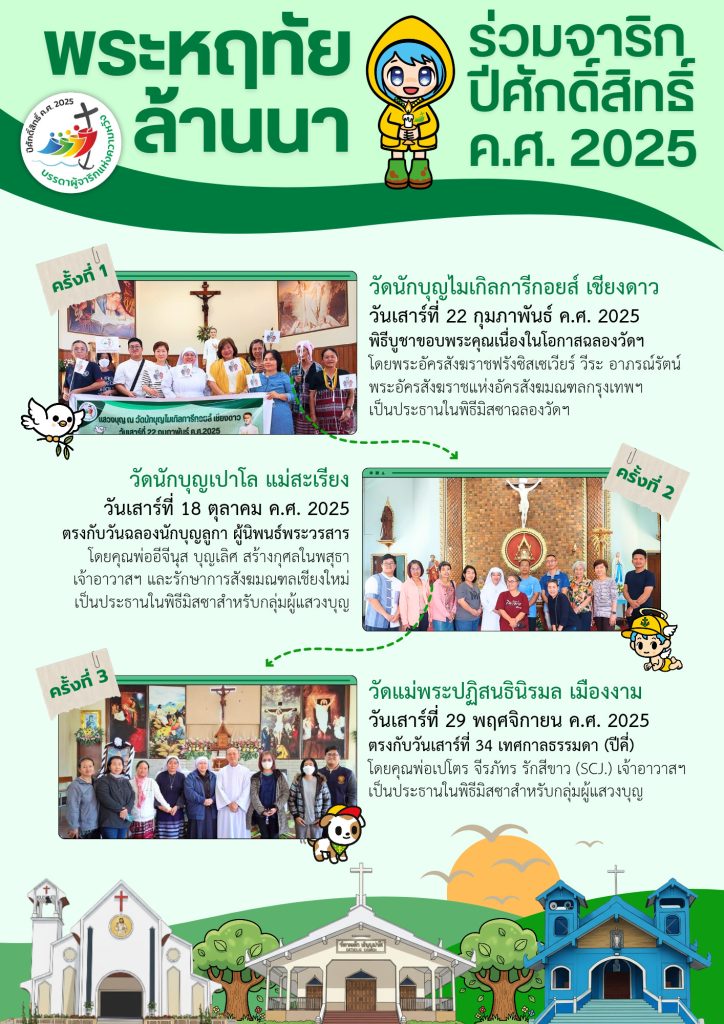 ตลอดปีศักดิ์สิทธิ์ ค.ศ. 2025 อธิการิณี สมาชิกบ้านพระหฤทัยล้านนา และสัตบุรุษวัดน้อยบ้านพระหฤทัยล้านนา ได้ร่วมกันดำเนินกิจกรรมฝ่ายจิตภายใต้หัวข้อ “บรรดาผู้จาริกแห่งความหวัง” โดยการเดินทางไปแสวงบุญยังวัดต่าง ๆ ในสังฆมณฑลเชียงใหม่ ตามที่พระศาสนจักรกำหนด เพื่อขอรับพระคุณการุณย์เนื่องในโอกาสปีศักดิ์สิทธิ์ การจาริกครั้งนี้ไม่เพียงเป็นการปฏิบัติตามข้อกำหนดของพระศาสนจักร แต่ยังเป็นช่วงเวลาแห่งพระหรรษทานที่สัตบุรุษได้ร่วมกันภาวนา เสริมสร้างความเชื่อ และแสวงหาความหวังที่แท้จริงในพระคริสตเจ้า นอกจากนี้ วัดน้อยบ้านพระหฤทัยล้านนาได้เชิญชวนและรณรงค์ให้สัตบุรุษเข้าร่วมกิจศรัทธาอื่น ๆ อย่างต่อเนื่อง เพื่อให้ทุกคนได้ใช้โอกาสพิเศษนี้ในการฟื้นฟูชีวิตฝ่ายจิตและการดำเนินชีวิตคริสตชนอย่างมั่นคง กิจกรรมทั้งหมดสะท้อนถึงความตั้งใจของชุมชนคริสตชนในการเป็นพยานแห่งความเชื่อ ความรัก และความหวัง โดยยึดพระวาจาเป็นแนวทางชีวิตตามคำสอนของนักบุญเปาโลที่ว่า “ความหวังนี้ไม่ทำให้เราผิดหวัง” (โรม 5:5) การจาริกและกิจกรรมฝ่ายจิตในปีศักดิ์สิทธิ์ครั้งนี้จึงเป็นสัญลักษณ์แห่งความร่วมมือ ความศรัทธา และความหวังที่ยังคงมีชีวิตอยู่ในใจของสัตบุรุษบ้านพระหฤทัยล้านนา และเป็นแรงบันดาลใจให้คริสตชนทุกคนดำเนินชีวิตอย่างมั่นคงในพระเจ้า แหล่งที่มา : https://www.facebook.com/share/p/1ABcdeoTfo/