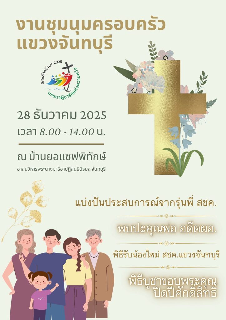 ขอรวมพลพี่น้อง สชค.แขวงจันทบุรี ทุกรุ่น ร่วมย้อนความทรงจำและย้ำความประทับใจ พบกันในงานชุมนุมครอบครัว แขวงจันทบุรี วันอาทิตย์ที่ 28 ธันวาคม ค.ศ. 2025 เวลา 08.00 – 14.00 น. ณ บ้านยอแซฟพิทักษ์ อาสนวิหารฯ จันทบุรี ภายในงานมีกิจกรรมไฮไลต์เพื่อสร้างความอบอุ่นและเชื่อมสายสัมพันธ์ ได้แก่ เวลา 15.00 น. เชิญร่วมพิธีบูชาขอบพระคุณปิดปีศักดิ์สิทธิ์ ณ อาสนวิหารฯ จันทบุรี ขอเชิญพี่น้องทุกท่านร่วมกระจายข่าวให้ทั่วถึง และมาร่วมกันสร้างบ้านนี้ให้แข็งแรง สานฝันอนาคตของ สชค. ให้ยาวนานที่สุด แล้วพบกันในวันงาน แหล่งที่มา : https://www.facebook.com/share/p/17derYd9hS/