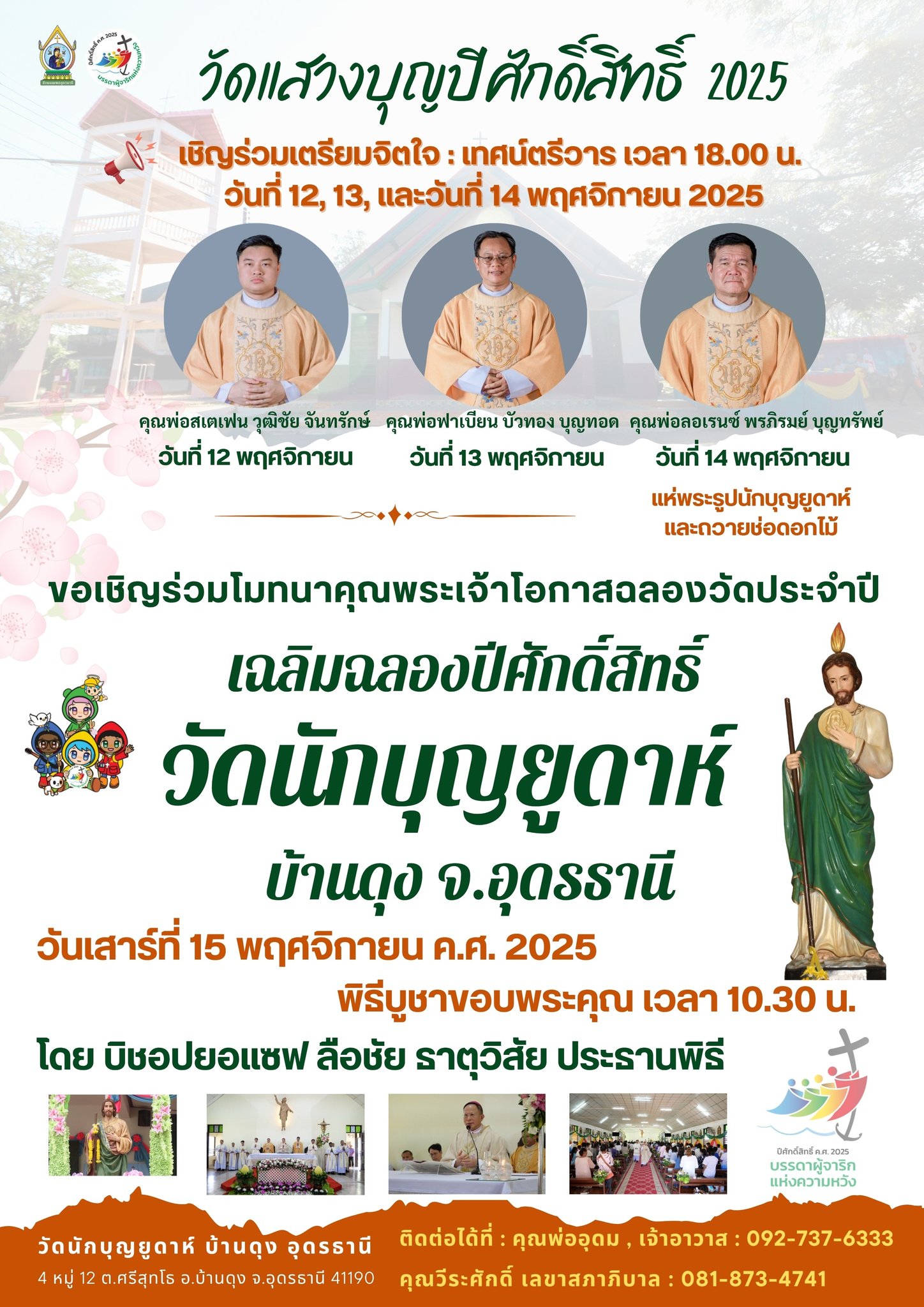 วัดนักบุญยูดาห์ บ้านดุง จังหวัดอุดรธานี ขอเชิญพี่น้องสัตบุรุษร่วมโมทนาคุณพระเจ้าในโอกาสพิเศษแห่งความเชื่อ คือ การฉลองวัดประจำปี พร้อมกับการ เฉลิมฉลองปีศักดิ์สิทธิ์ ค.ศ. 2025 เขต 2 สังฆมณฑลอุดรธานี ภายใต้จิตตารมณ์ “บรรดาผู้จาริกแห่งความหวัง” ซึ่งพระศาสนจักรสากลกำหนดให้เป็นปีแห่งการฟื้นฟูชีวิตฝ่ายจิตและความหวังในพระคริสตเจ้า
