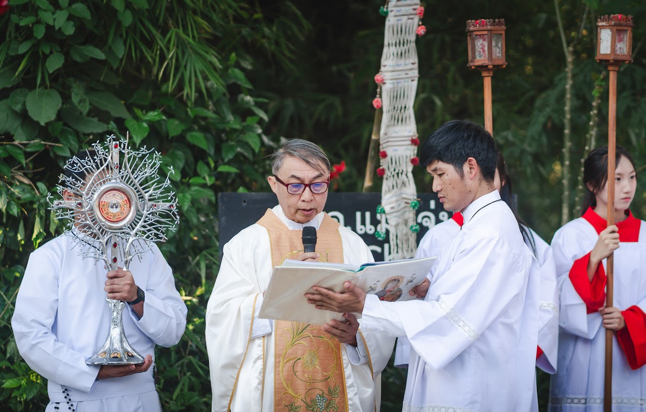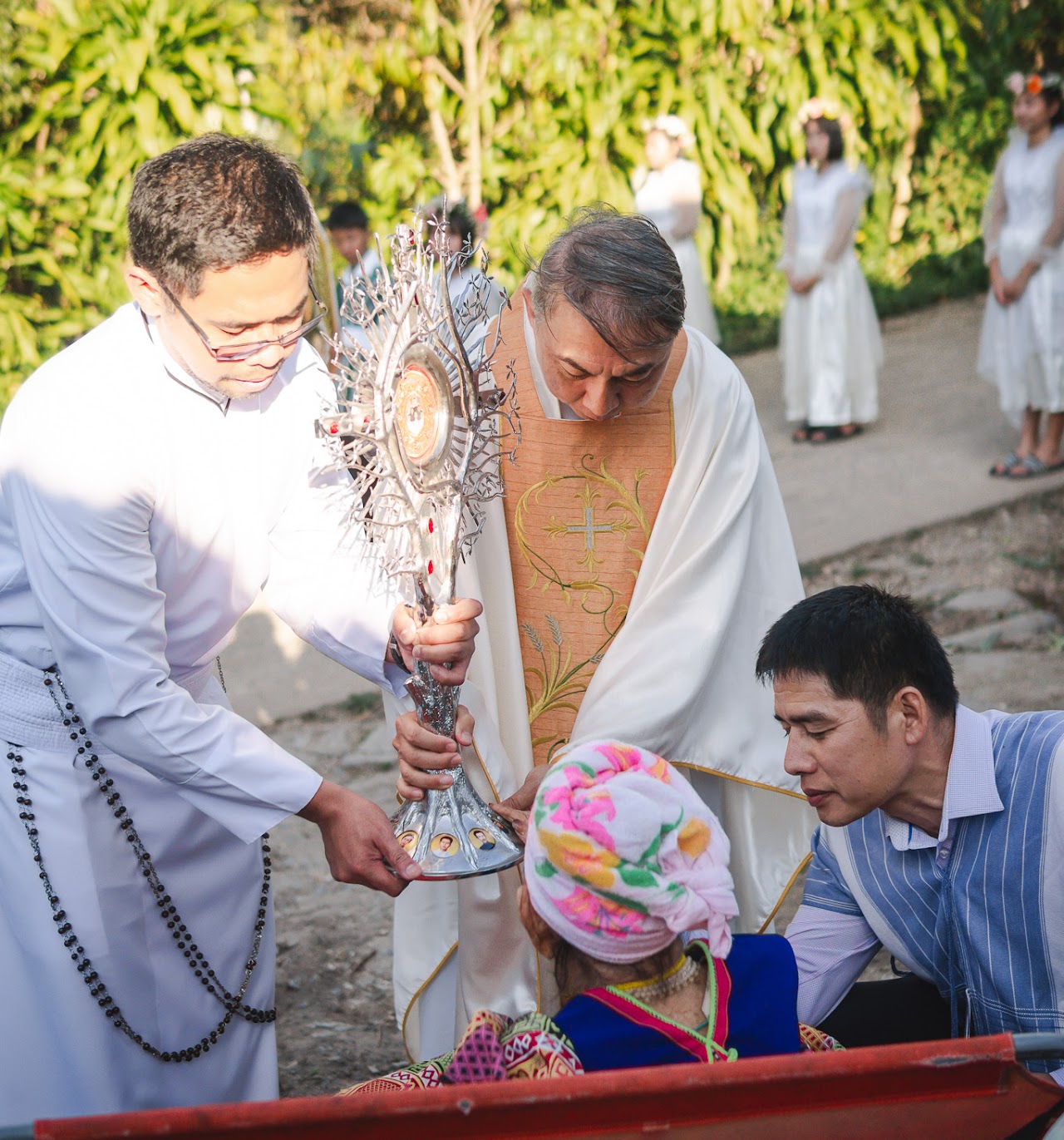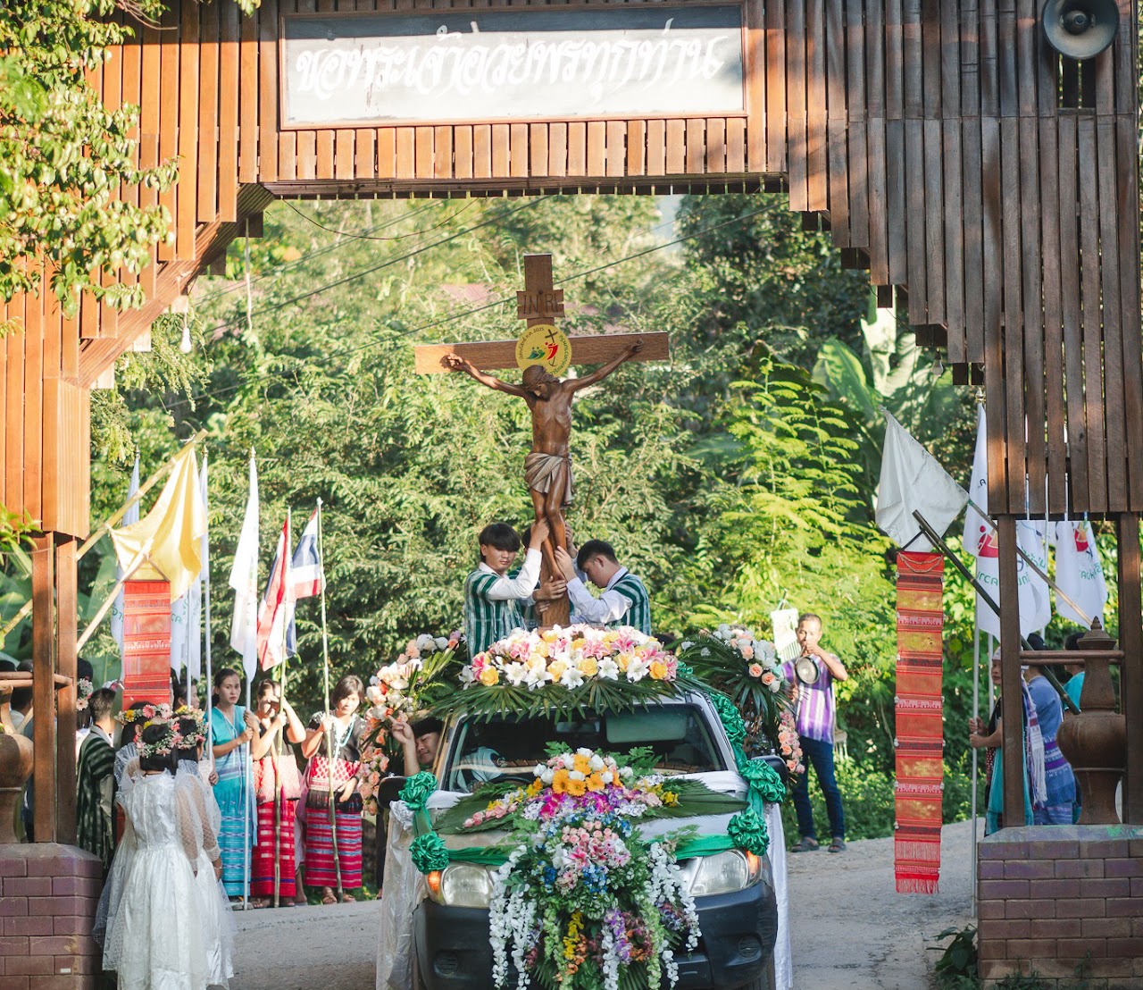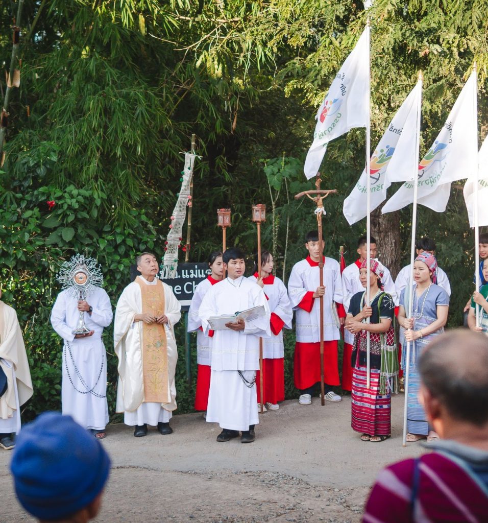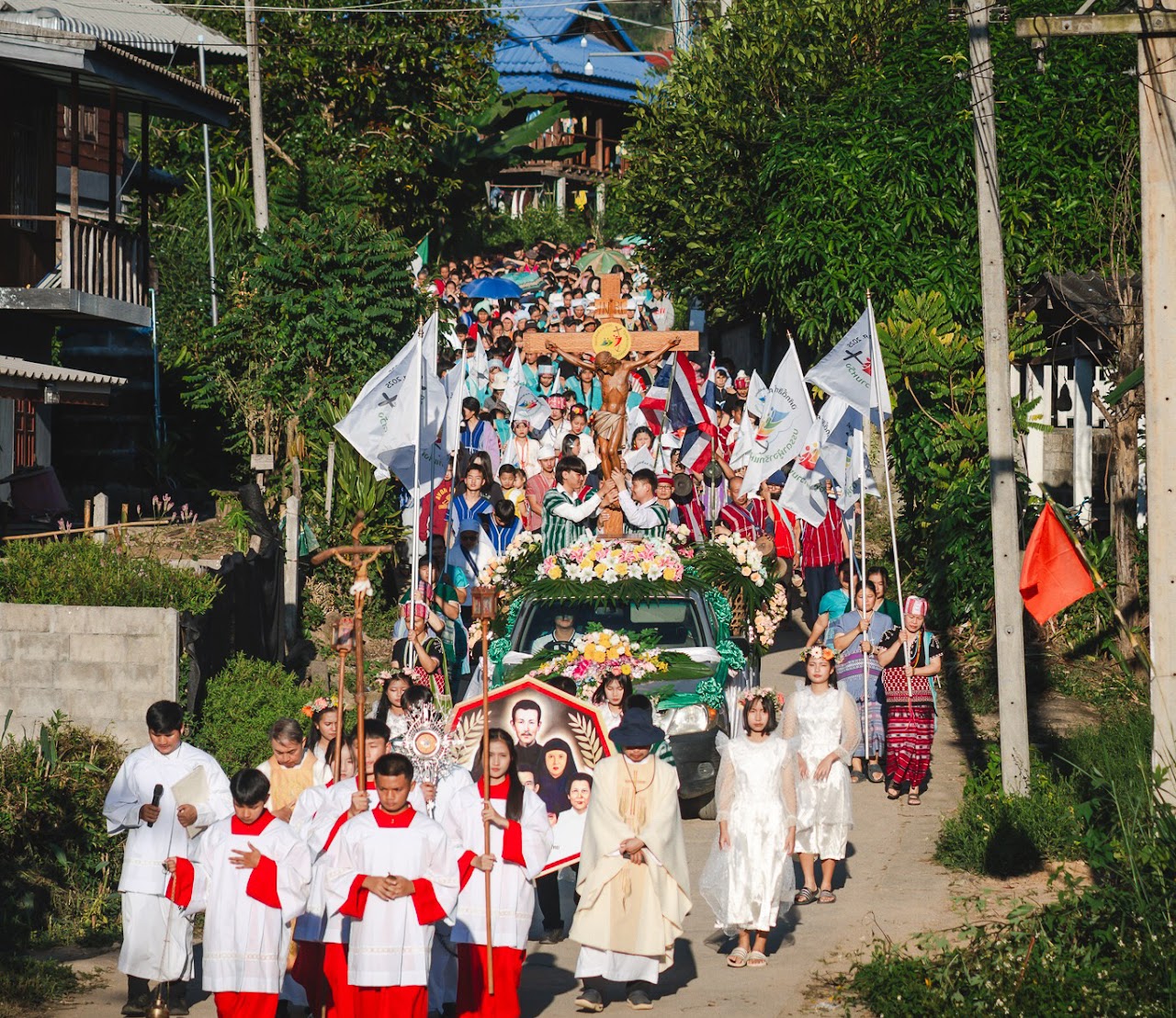 ก่อนเริ่มพิธีบูชามิสซา มีการประกอบพิธีอัญเชิญพระธาตุบริเวณหน้าหมู่บ้าน โดยบรรยากาศเต็มไปด้วยความศักดิ์สิทธิ์และความศรัทธา มีการอวยพรที่ซุ้มประตูหมู่บ้าน การรำลึกถึงคุณพ่อโฟญีนี ผู้บุกเบิกงานธรรมทูตในพื้นที่ พร้อมขบวนรถแห่ไม้กางเขนและพระธาตุบุญราศีทั้ง 8 เสียงบทเพลง การสวดสายประคำ และคำภาวนาของสัตบุรุษช่วยแต่งเติมบรรยากาศให้เปี่ยมด้วยความสงบลึกซึ้ง ขบวนยังได้แวะอวยพรผู้ป่วยและผู้สูงอายุในหมู่บ้านต่าง ๆ ที่ไม่สามารถมาร่วมพิธีได้ด้วยตนเอง